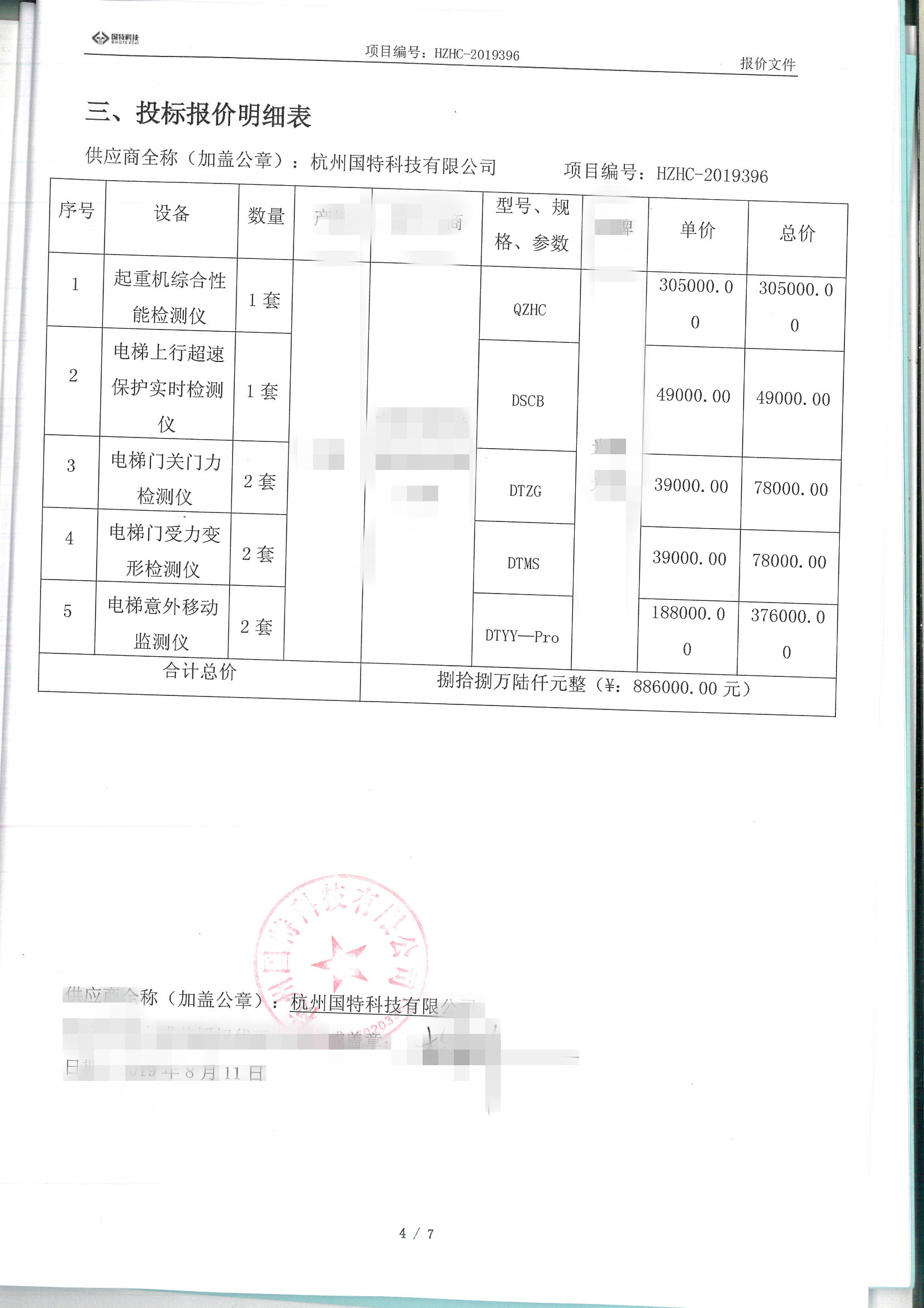 | 1 | 起重機、電梯綜合性能檢測儀等設備采購項目 | 杭州國特科技有限公司 | 詳見(jiàn)附件 | 1批 | 886000 | 杭州市西湖區留下街道留和路56號1幢405室 |  九、評審小組成員名單:黃俞成、王力、賴(lài)云祥、李明、方永蘭(采購人代表) 十、公告期限:1個(gè)工作日 十一、其它事項:       各參加政府采購活動(dòng)的供應商認為該中標結果和采購過(guò)程等使自己的權益受到損害的,可以自本公告期限屆滿(mǎn)之日(本公告發(fā)布之日后第2個(gè)工作日)起7個(gè)工作日內,以書(shū)面形式向采購人提出質(zhì)疑。質(zhì)疑供應商對采購人、采購代理機構的答復不滿(mǎn)意或者采購人、采購代理機構未在規定的時(shí)間內作出答復的,可以再答復期滿(mǎn)后十五個(gè)工作日內向同級政府采購監督管理部門(mén)投訴。質(zhì)疑函范本、投訴書(shū)范本請到浙江政府采購網(wǎng)下載專(zhuān)區下載。 十二、聯(lián)系方式:    1、采購代理機構名稱(chēng):浙江華誠建設工程招標代理有限公司 聯(lián)系人:孫靜 聯(lián)系電話(huà):0572-2506626 地址:湖州市祥和花園西區29幢1樓 2、采購人名稱(chēng):湖州市特種設備檢測研究院 聯(lián)系人:方女士 聯(lián)系電話(huà):0572-2523106 3、同級政府采購監督管理部門(mén)名稱(chēng):湖州市財政局政府采購監管處 聯(lián)系人:何先生 監督投訴電話(huà):0572-2150037  起重機、電梯綜合性能檢測儀價(jià)格公示_副本.jpg